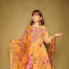 To recreate this look for celebration, opt for a floral Anarkali in warm, festive hues like mustard or peach. Pair with statement earrings and delicate rings and style up your hair in soft curls or a half-updo.A burst of festive glam